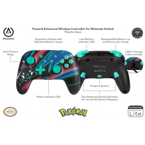 Odličen kontroler za vse oboževalce Pokémonov, ta uradno licenciran PowerA Enhanced Wireless Controller za Nintendo Switch v neon Pikachu poslikavi, nadzorom gibanja* in dvema nastavljivo programibilna igralnima gumba..